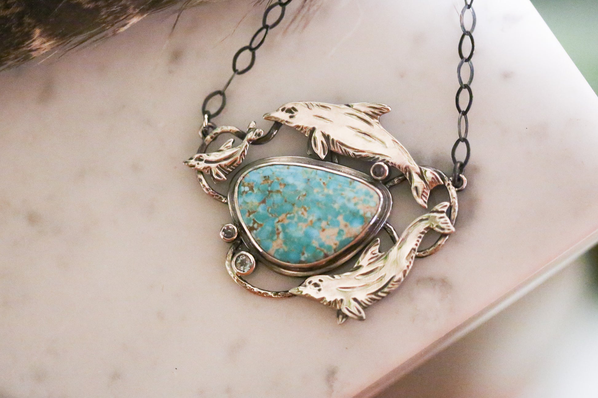This necklace features a natural #8 turquoise (cabbed by me) set in fine silver bezel on a sterling silver back. A handmade sterling silver dolphin family swims around the stone, connected by sturdy sterling silver wire. The necklace is accented with tube set light purple tanzanite and light blue apatite. This necklace will come with a 18" sterling silver chain with a lobster clasp. If you prefer to not to receive a chain with your pendant use code NOCHAIN for $15 off.