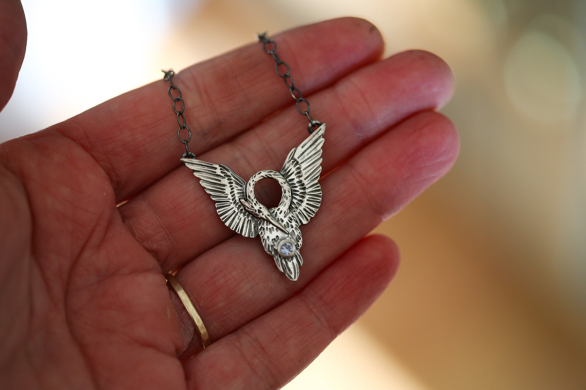 This heron has been handmade from four layers of sterling silver to create a one of a kind necklace. A single light blue sapphire is clasped in the heron's talons. This pendant hangs from a 17" sterling silver chain with a lobster clasp.