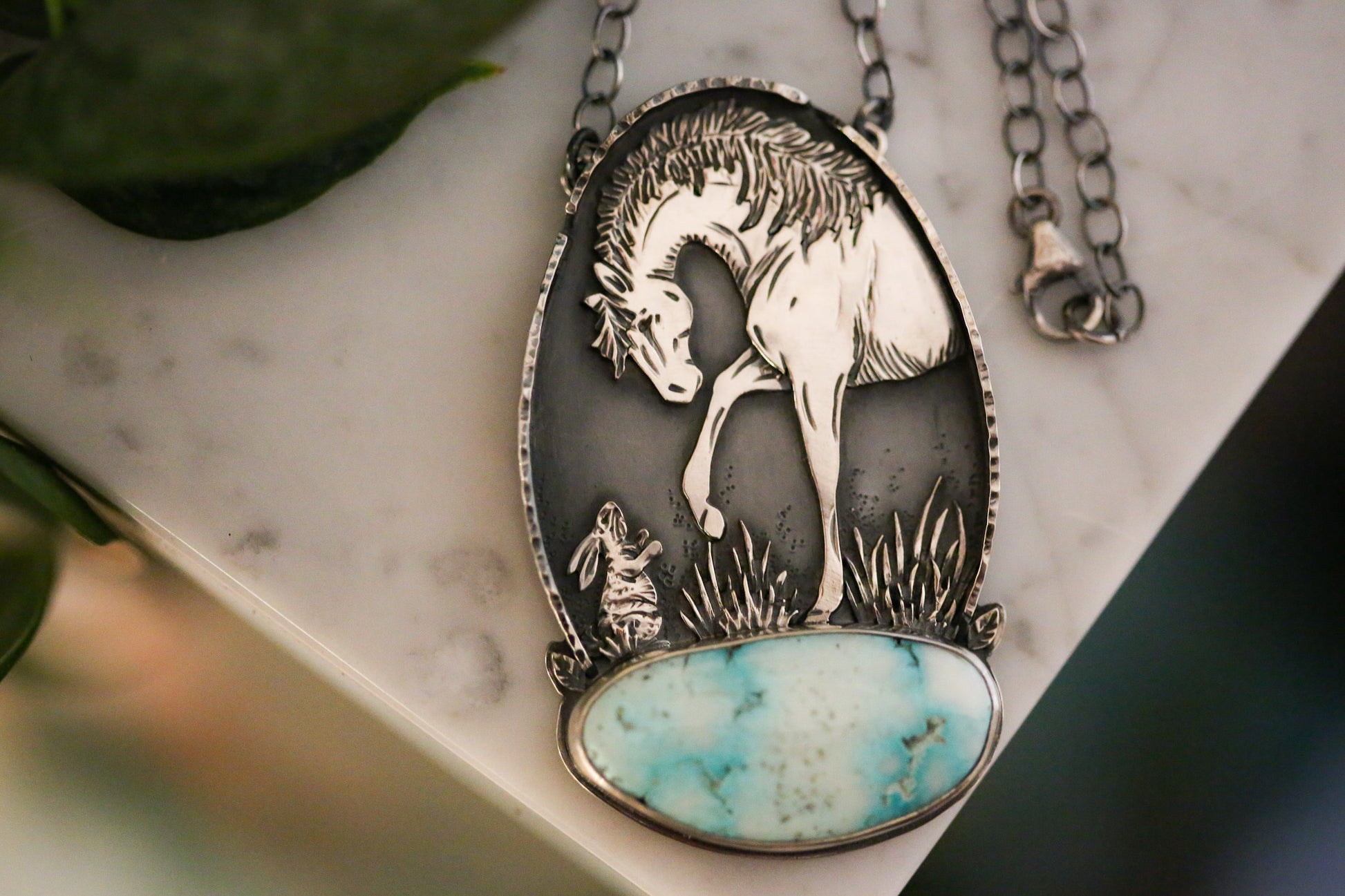 This necklace features a unique Big Nugget mine turquoise set in fine silver bezel on a sterling silver back. White turquoise that is this hard and takes a great polish is rare! Above the stone is are a handmade horse and bunny with grasses nestled around them. This pendant hangs from a 18" sterling silver chain with a lobster clasp.