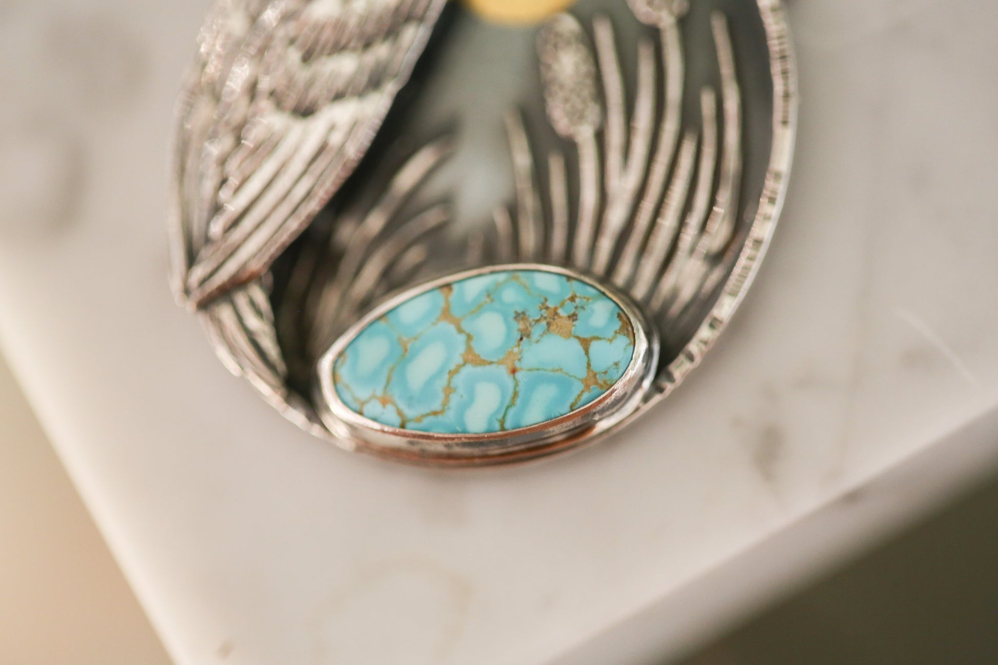 This necklace features a natural #8 turquoise (cabbed by me) set in fine silver bezel on a sterling silver back. A single handmade sterling silver kingfisher flies beside it with a wetland scene in the background, framed in sterling silver. A 24k gold keum boo sun rises in the background. This necklace will come with a 18" sterling silver chain with a lobster clasp. If you prefer to not to receive a chain with your pendant use code NOCHAIN for $15 off.