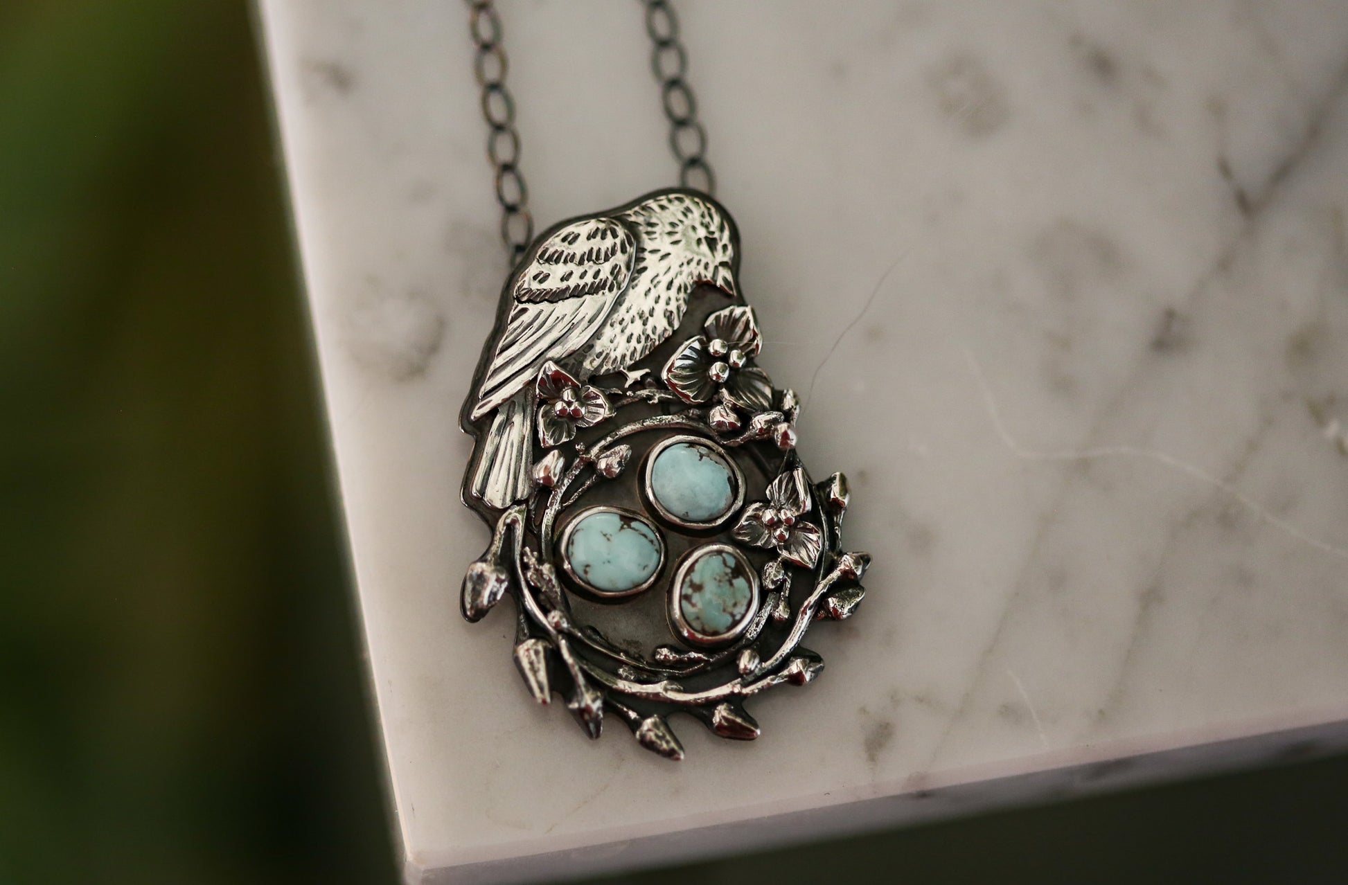 This necklace features three natural Valley Blue turquoise 'eggs' set in fine silver bezel on a sterling silver back. These eggs are nestled in a nest made up of sterling silver cast branches, adorned with handmade sterling silver flowers. Looking over the nest is a mama bird who has been handmade from sterling silver. This pendant hangs from a hidden bail on a 18" sterling silver chain with a lobster clasp.