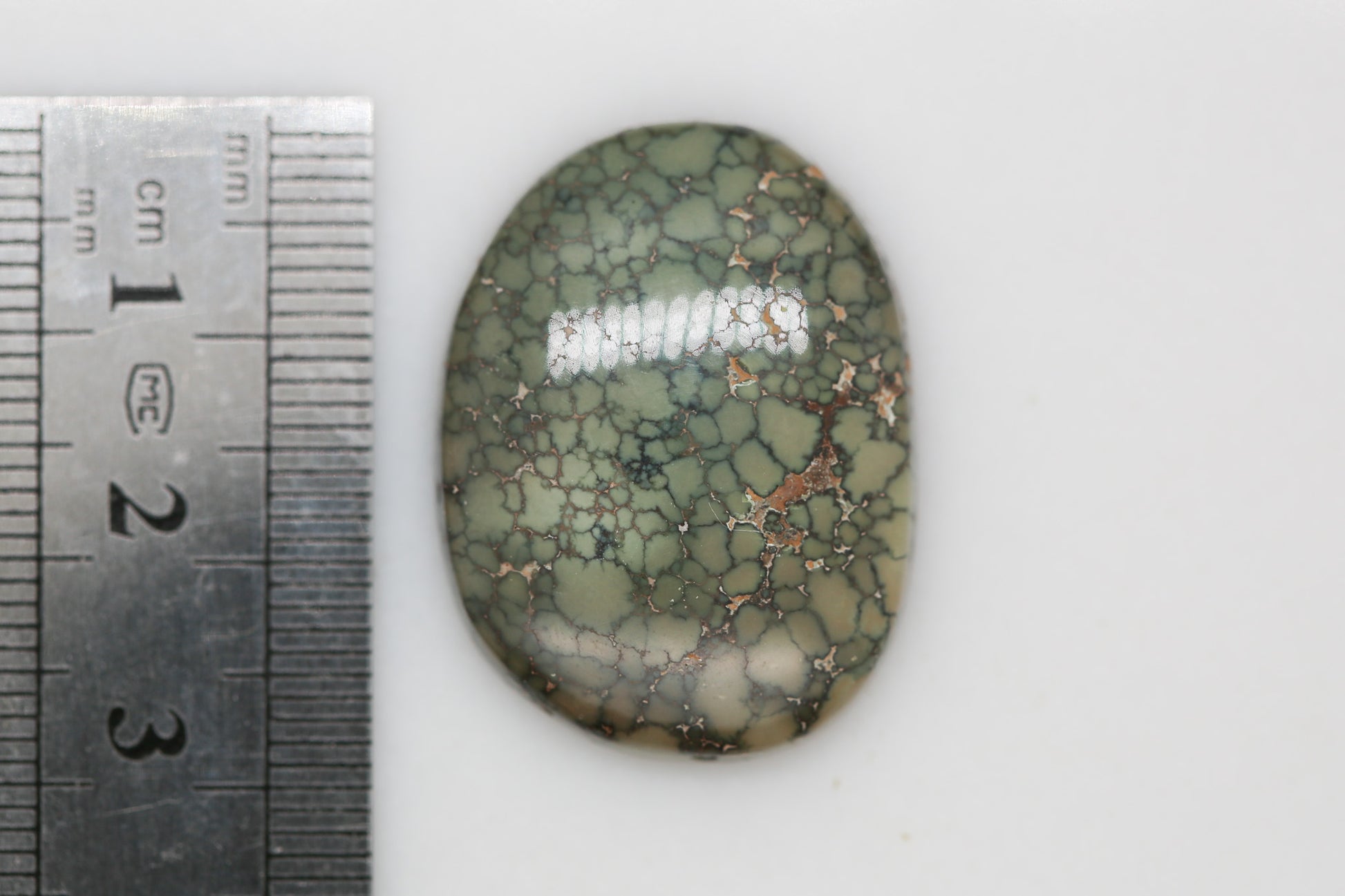 27.5 carat natural webbed Damele turquoise cabochon. Approximately 28x21x5.5mm. Backed for support. Matrix shows minor pitting. $8/carat