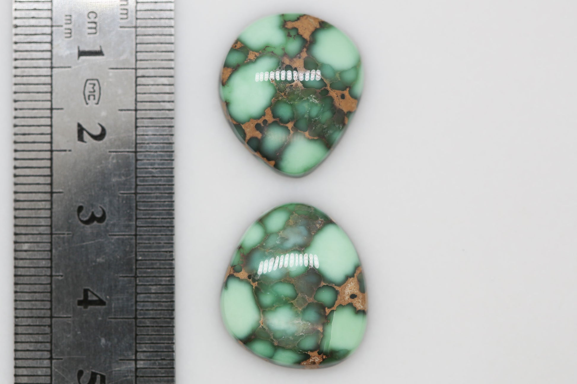Incredible 27 carat natural webbed Damele turquoise cabochon matched pair. Approximately 20x18x5.8mm and 20.5x18x5.5mm. Backed for support. $25/carat. The most stunning pair I've ever cut.