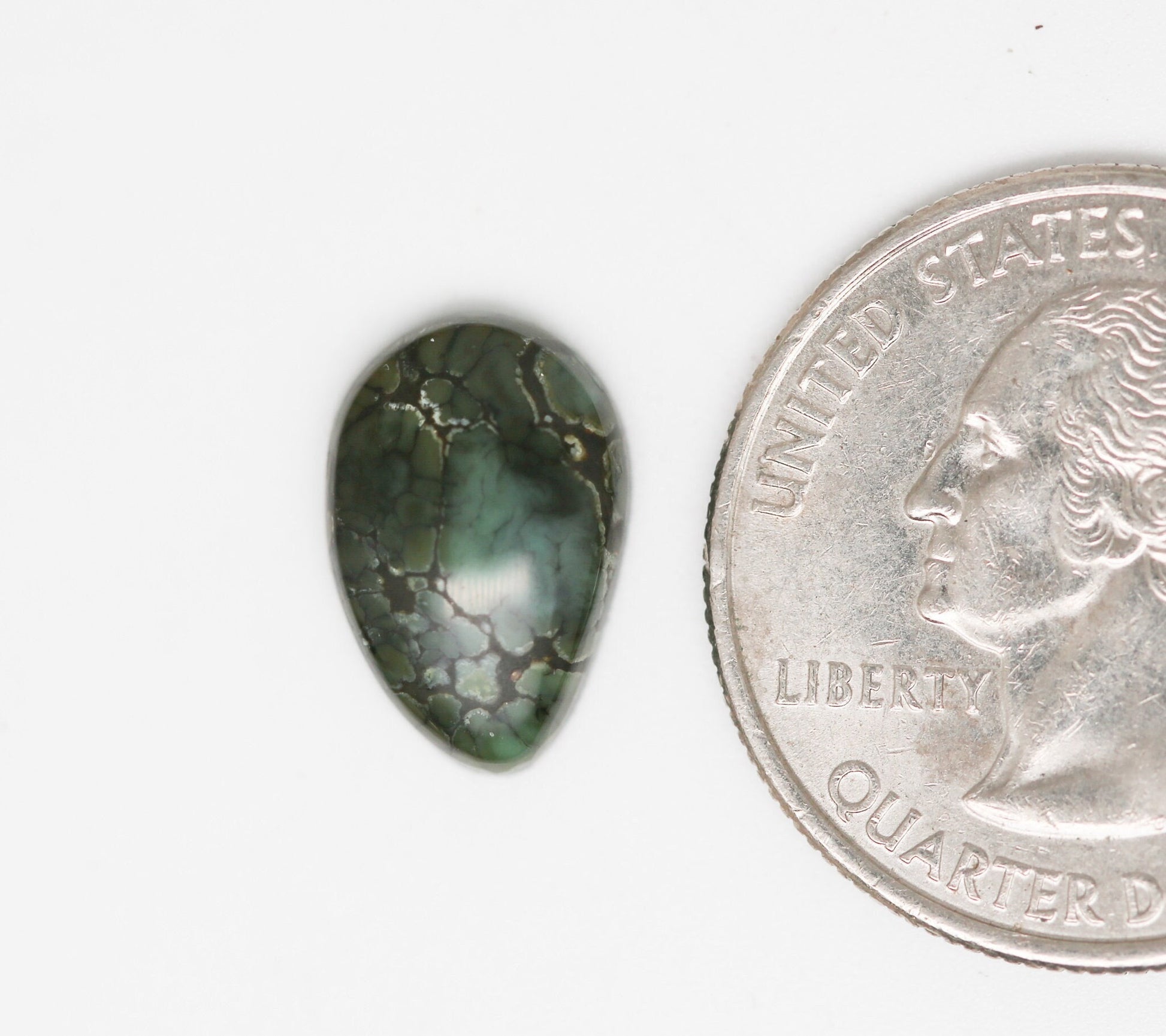 4 carat natural Snowville variscite cabochon set. Backed for support. Quarter for size reference only.