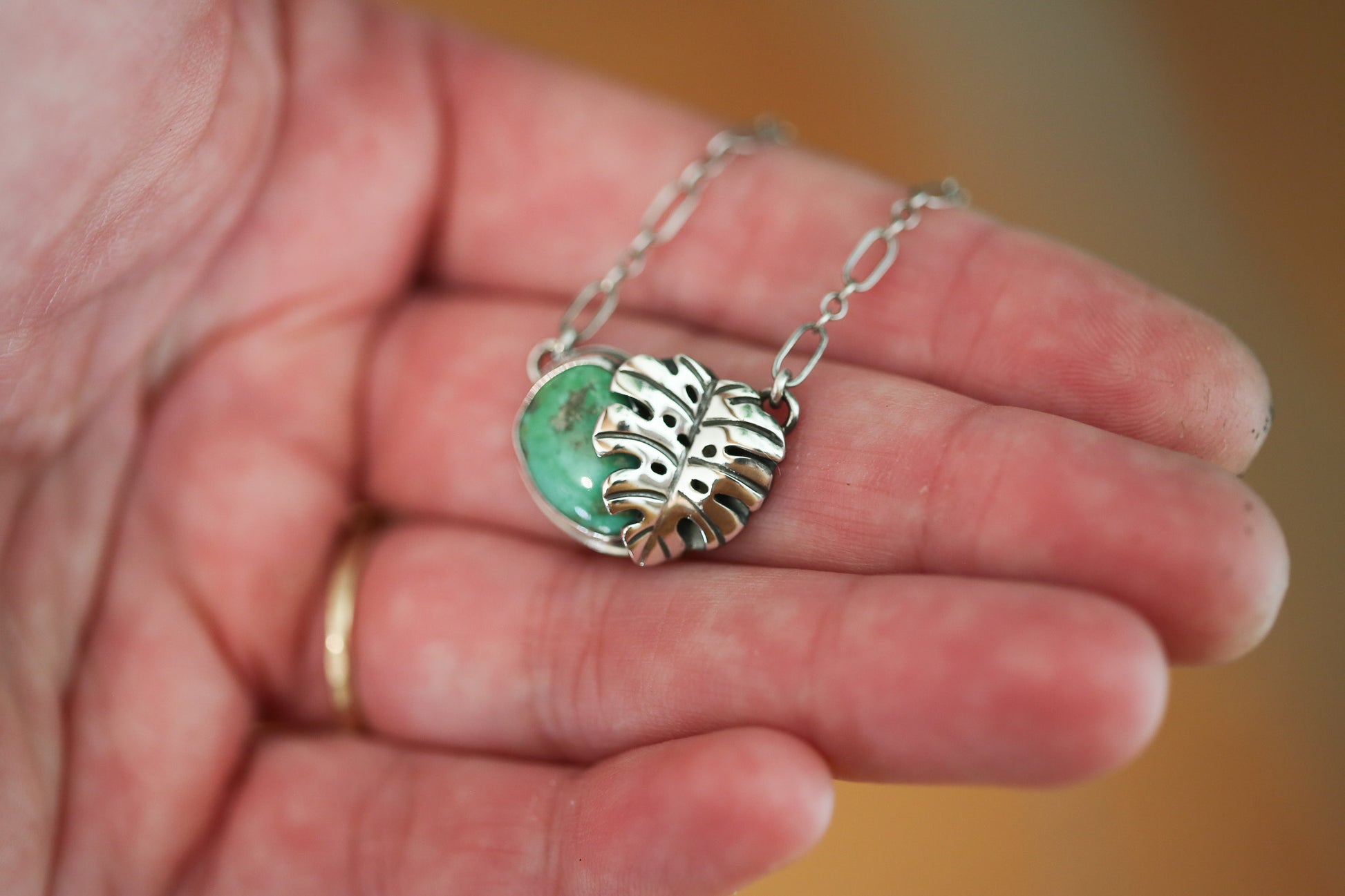 This necklace features a natural X-15 turquoise (cabbed by me) set in fine silver bezel on a sterling silver back. Overlapping the side of the stone is a handmade monstera leaf. This necklace hangs from a 16" sterling silver chain with a lobster clasp.